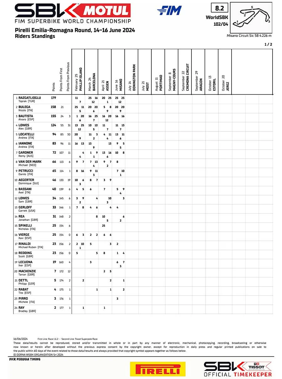 Dengan tiga kemenangan di Misano ini, Toprak sekarang kokoh di puncak klasemen dengan keunggulan 21 poin dari Nicolo Bulega yang berada di posisi kedua menggeser Alvaro Bautista di peringkat ketiga.