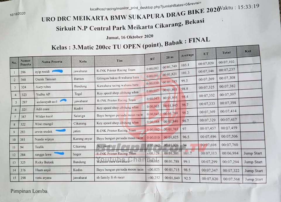BalapMotor.Net – Pada laga URO DRC Meikarta BMW Sukapura Drag Bike 2020 kemarin (16/10), Matic 200cc dengan julukan “Kian Santang” mampu memecahkan rekor nasional kelas Matic 200cc TU.