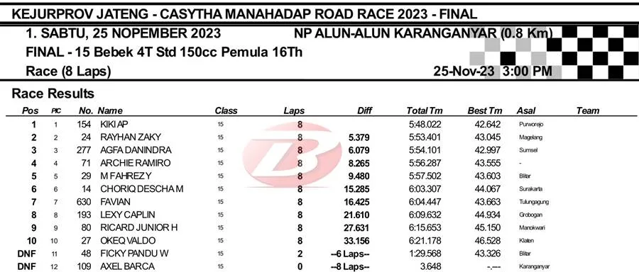 BalapMotor.Net – Pembalap muda asal Bagelen, Purworejo, Jawa Tengah yaitu Kiki Aprianto berhasil menjadi yang terbaik pada race final kelas Bebek 4 Tak 150cc STD Usia Maksimal 16 tahun Final Casytha Manahadap Kejurprov Jateng 2023 di Karanganyar (25/11).