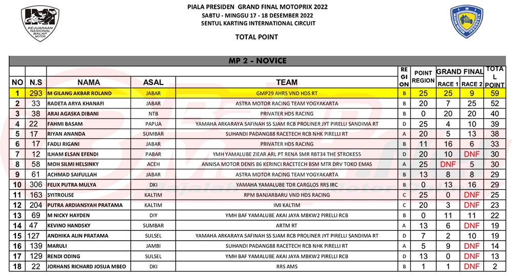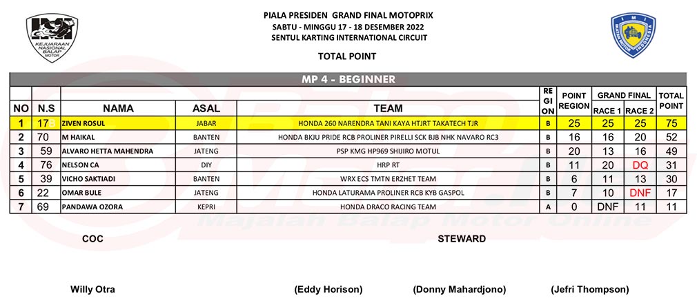 BalapMotor.Net – Berikut merupakan klasemen akhir dari gelaran Piala Presiden Kejurnas Motoprix 2022 setelah digelarnya grand final Motoprix 2022 yang digelar di sirkuit Sentul Karting, Bogor pada 17-18 Desember 2022.