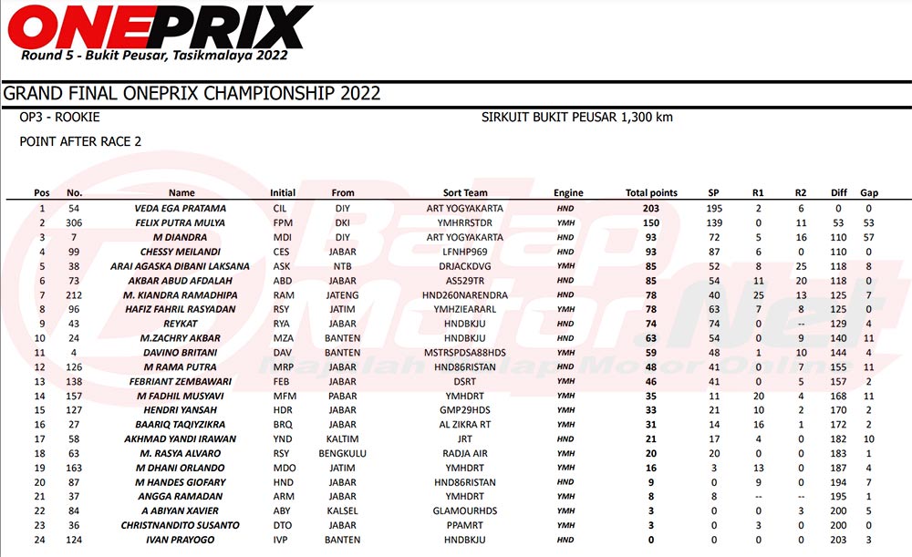 BalapMotor.Net – Berikut merupakan klasemen akhir dari gelaran Oneprix Championship musim 2022 setelah melewati race 2 Final Oneprix 2022 di Sirkuit Bukit Peusar Kota Tasikmalaya pada hari Minggu 27 November 2022.
