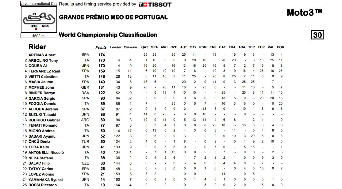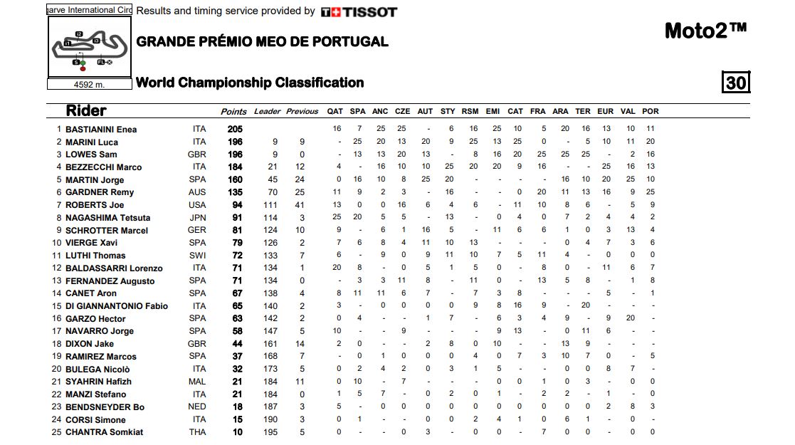 BalapMotor.Net – Berikut ini klasemen akhir untuk semua kelas di MotoGP musim 2020. Dengan berakhrinya gelaran MotoGP Portugal 2020 pada hari minggu (22/11) menjadi tanda bahwa MotoGP musim 2020 juga berakhir.