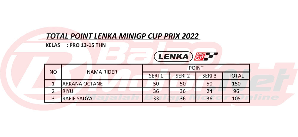 Buat yang pensaran siapa saja yang mempunyai kans sebagai juara umum, yuk pantengin langsung klasemen sementara LENKA MiniGP Cup Prix jelang ronde final yang akan digelar di sirkuit Sentul Paddoc.