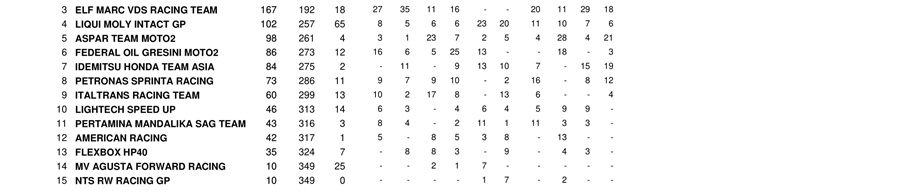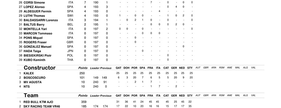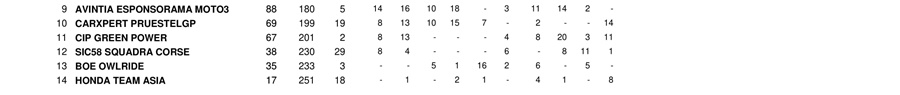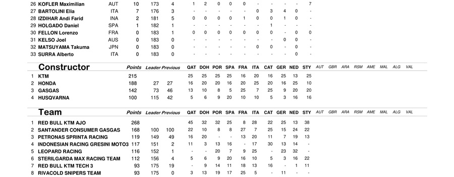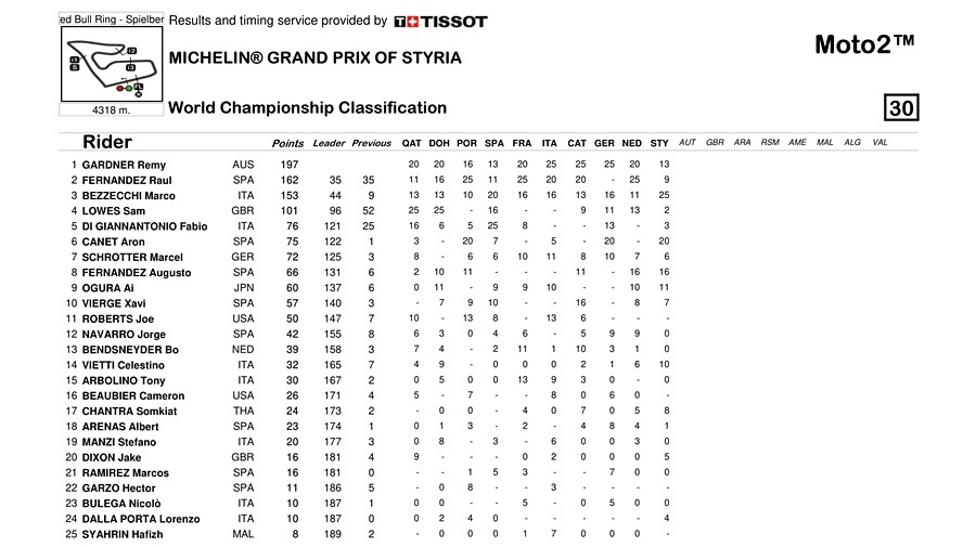 Di kelas Moto2, Remy Gardner semakin meninggalkan poin yang jauh dengan rekan setinya, Raul Fernandez. Selisih dua Red Bull KTM Ajo ini sekarang menjadi 35 angka. Hal yang sama juga berlaku pada kelas Moto3.