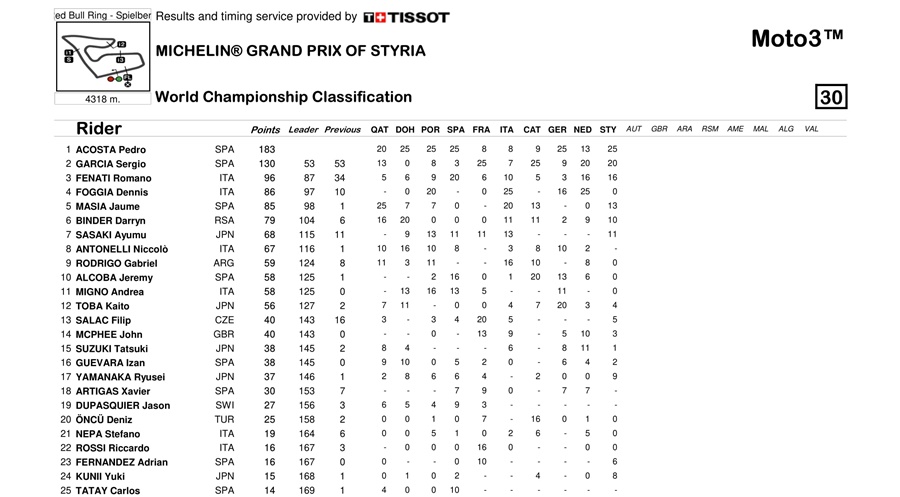 Dimana Pedro Acosta semakin meninggalkan jauh lawan terdekat yaitu Sergio Garcia dan pasca balapan Styria tadi menjadi selisih 53 poin.
