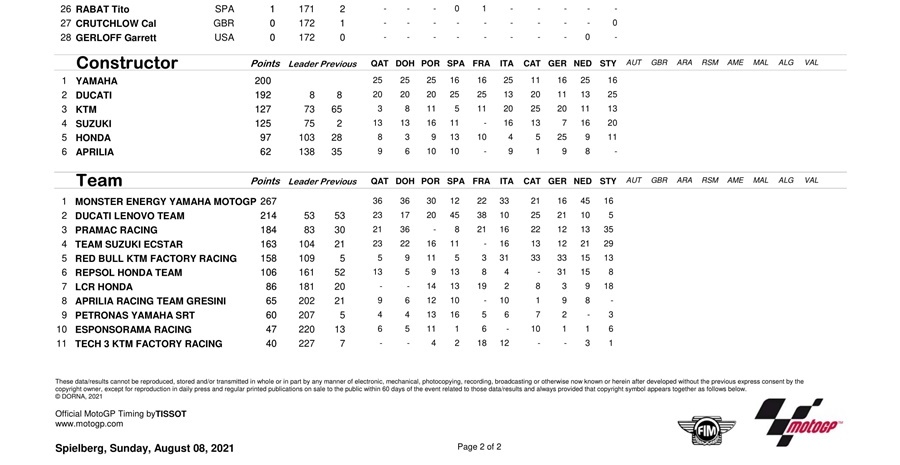 BalapMotor.Net – Berikut klasemen sementara Kejuaraan Dunia MotoGP, Moto2 dan Moto3 setelah putaran ke-10 Grand Prix Styria yang berlangsung di sirkuit Red Bull Ring, Spielberg, Austria (6-8 Agustus) 2021.