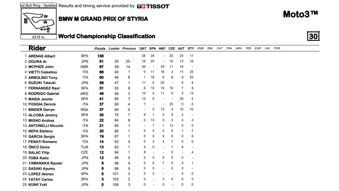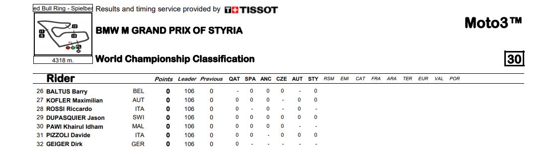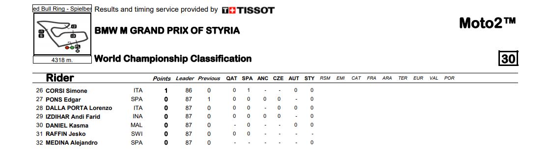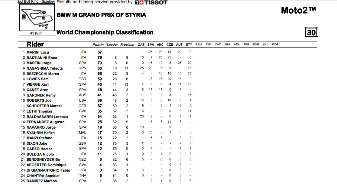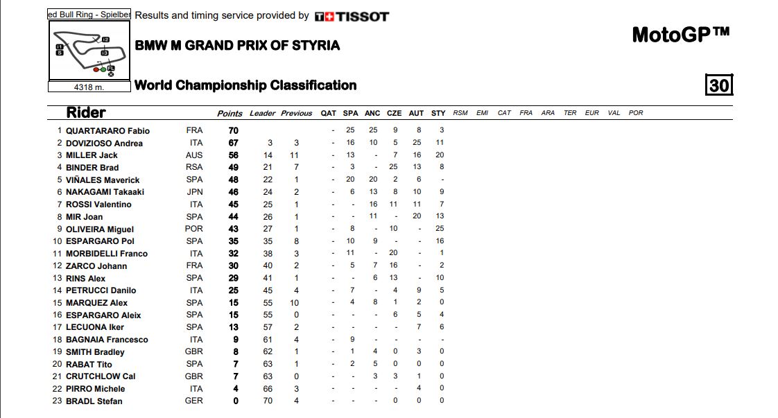 Klasemen Sementara MotoGP Semua Kelas Pasca Seri Styria 2020Penulis Fajar Sulistiono - 23/08/2020Foto: MotoGP BalapMotor.Net – Berikut ini merupakan hasil klasemen sementara untuk semua kelas dari gelaran MotoGP setelah melewati gelaran MotoGP Styria yang berlangsung di sirkuit Red Bull RIng Spielberg Austria pada 23 Agustus 2020.MotoGP Moto2 Moto3