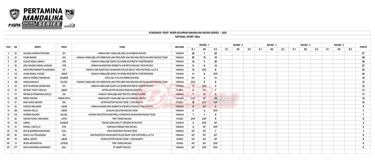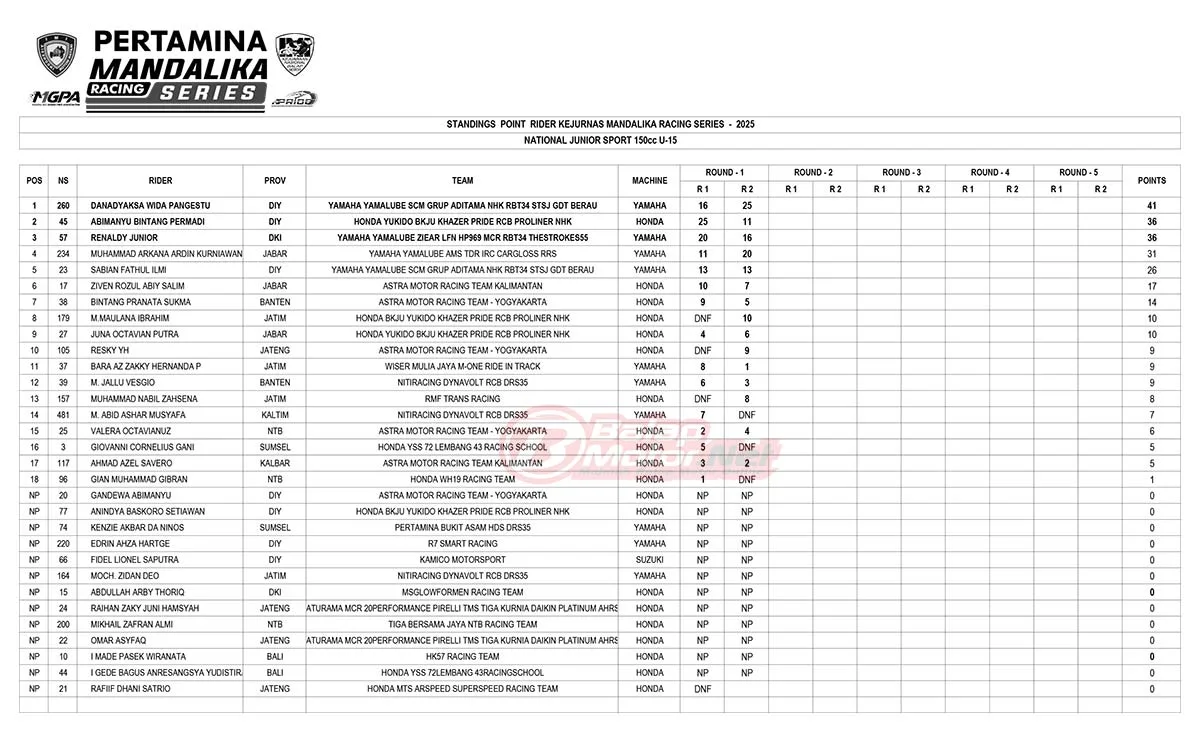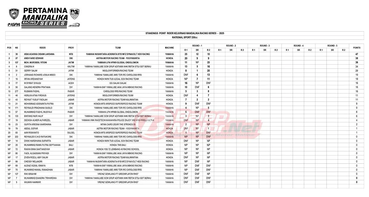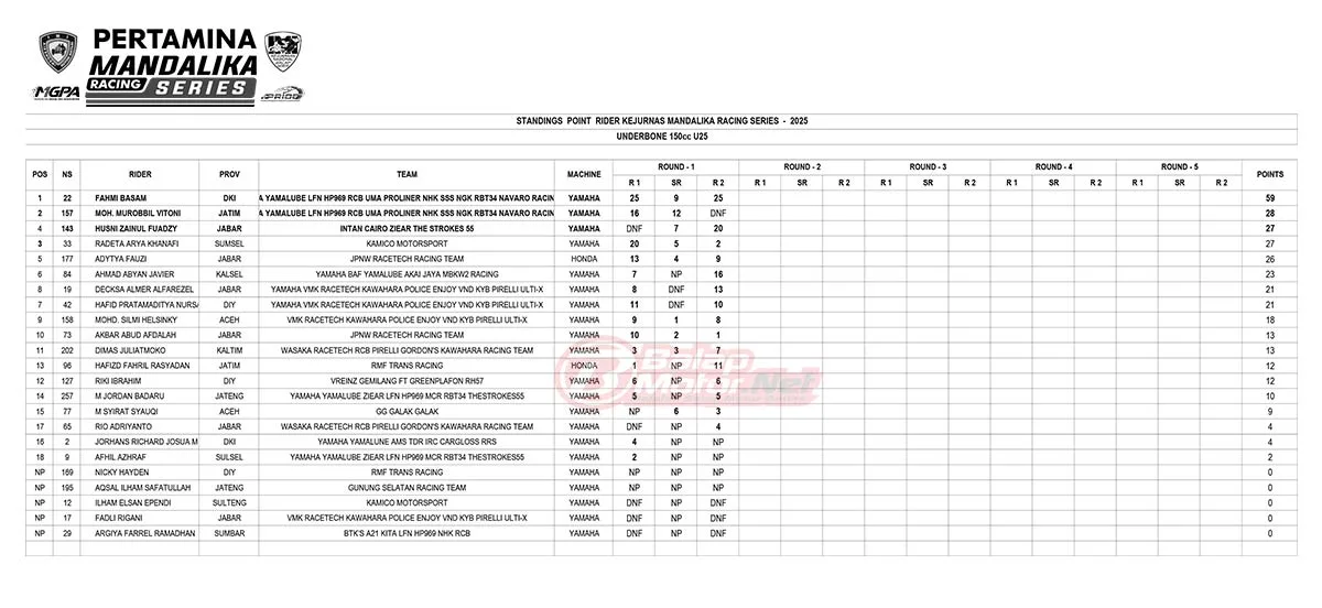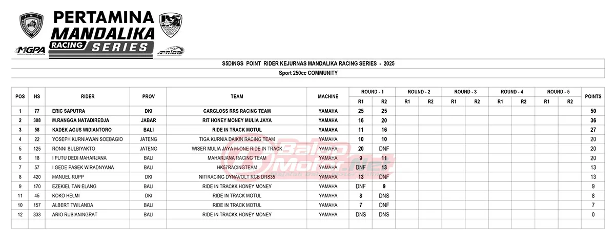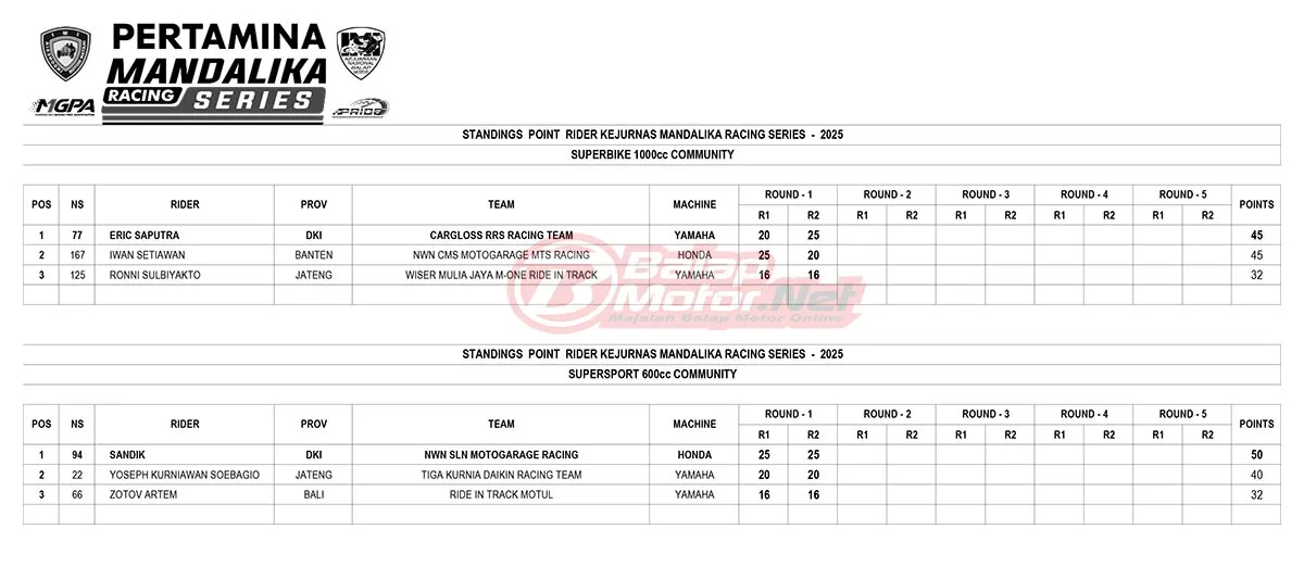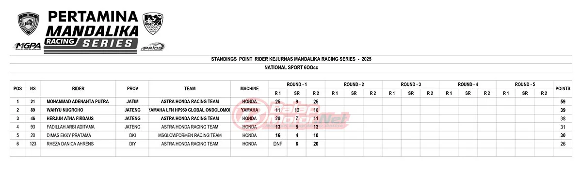 Klasemen Sementara Pertamina Mandalika Racing Series (MRS) 2025 Setelah Ronde 1