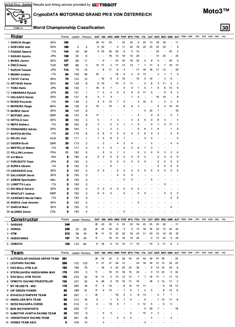 Di kelas terkecil Moto3, Sergio Garcia mengoleksi 193 poin dan unggul 5 angka dari posisi kedua. Sementara di kelas menengah Moto2, Ai Ogura sukses mengambil alih pimpinan klasemen.