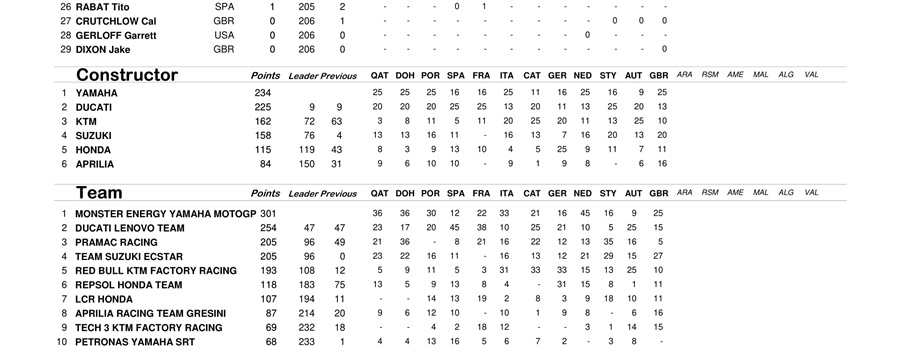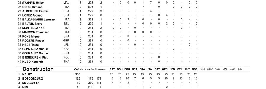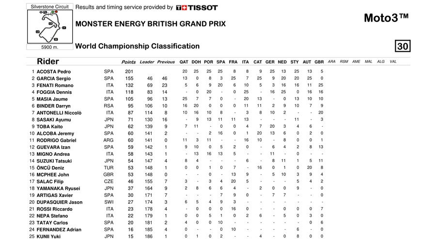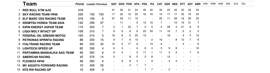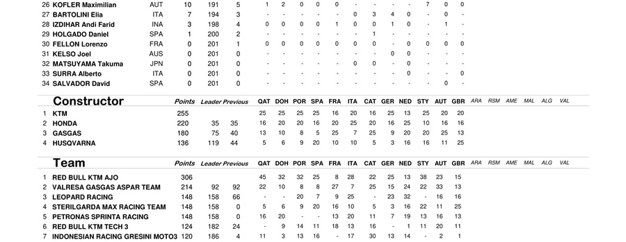 BalapMotor.Net – Berikut kami paparkan peringkat klasemen sementara pembalap, tim dan konstruktor Kejuaraan Dunia Moto3, Moto2 dan MotoGP setelah menyelesaikan putaran ke-12 yang berlangsung di sirkuit Silverstone, Inggris pada 27-29 Agustus 2021.
