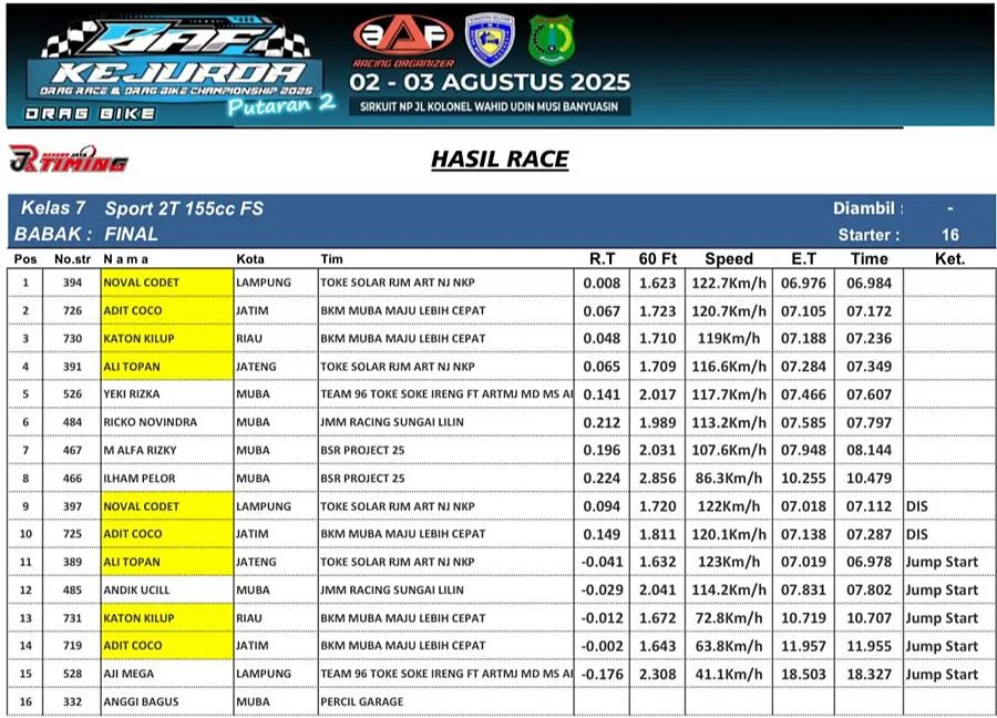 Sebelumnya motor ini juga jadi yang tercepat pada balap Samosir Drag Bike 27 Juli 2025, yang juga tembus 6.9 detik. Dengan hasil ini, Ninja Frame STD milik tim PT NKP Hasil Plastik cukup tangguh untuk dikalahkan.