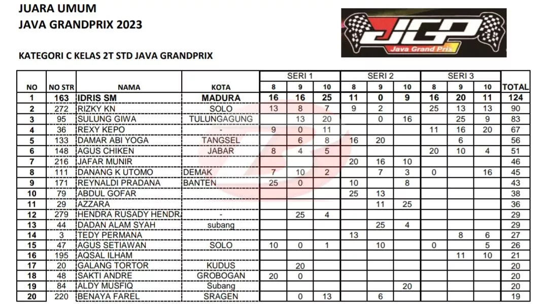 “Saya sangat senang dan bersyukur bisa memberikan gelar juara umum ini untuk tim. Terimakasih banyak atas supportnya,” jelas Idris SM yang tampil konsisten di barisan depan selama tiga putaran Java Grand Prix 2023.