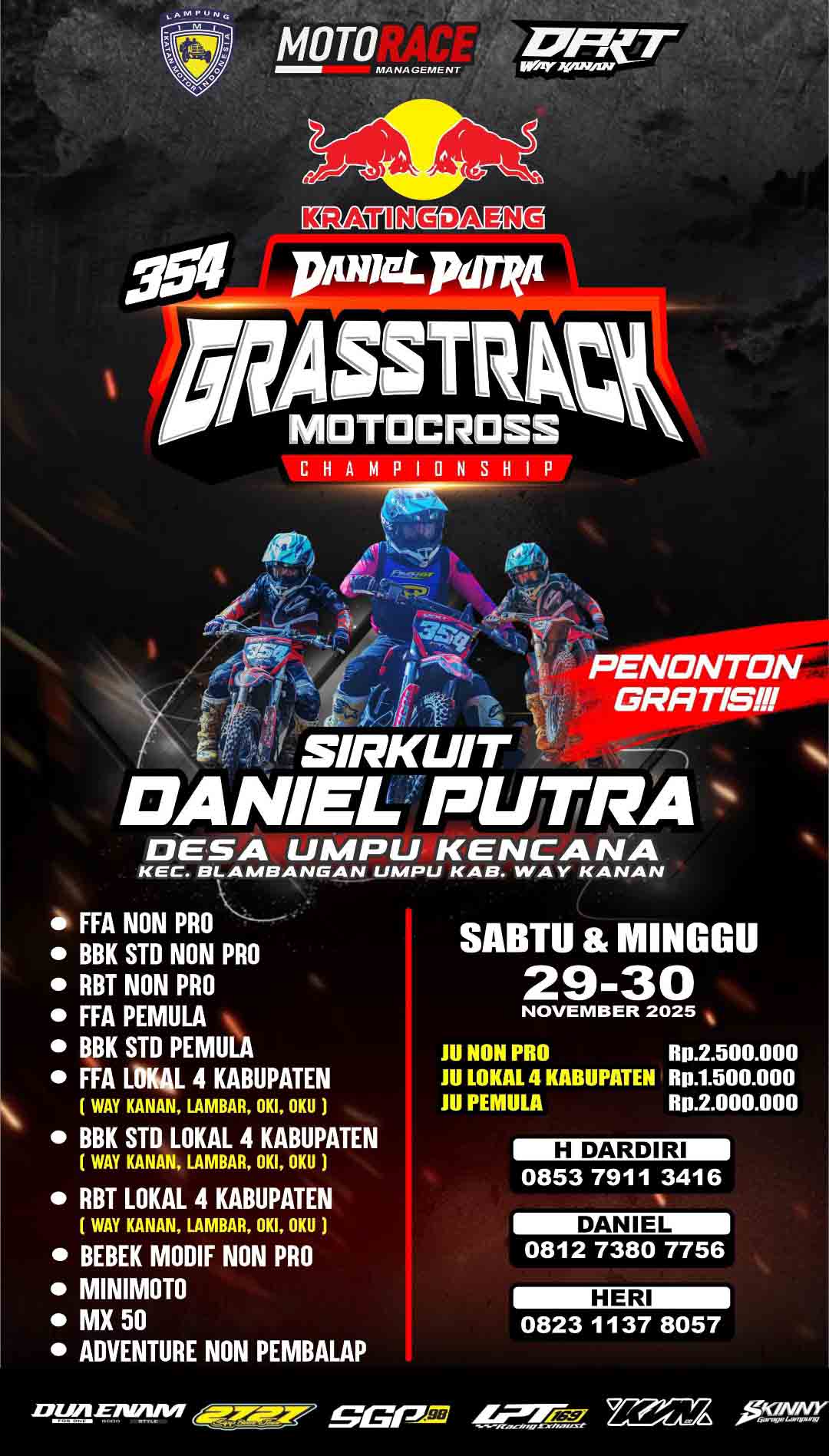 BalapMotor.Net – Kejuaraan grasstrack bertajuk “Kratindaeng Daniel Putra Grasstrack dan Motocross Championship” siap digelar pada akhir pekan ini, 29-30 November 2025. Event ini akan berlangsung di Sirkuit Daniel Putra, Desa Umpu Kencana, Kecamatan Blambangan Umpu, Kabupaten Way Kanan, Provinsi Lampung.