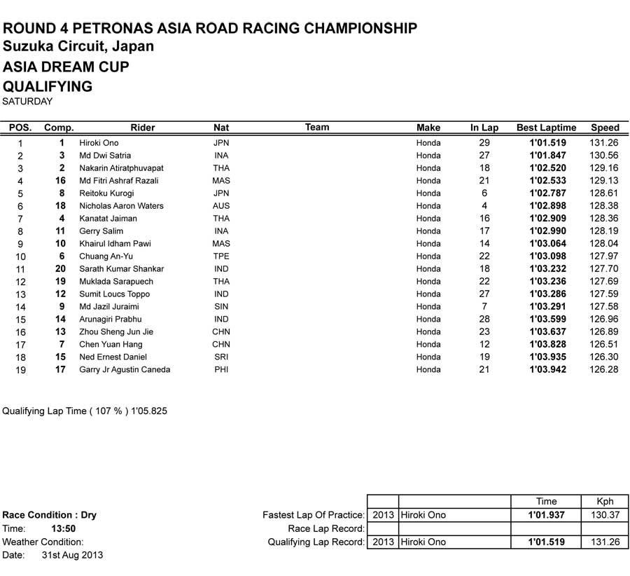 Disaat latihan bebas kemarin mungin pembalap kita mampu bersang di barisan depan tercepat dengan mengandalkan pembalap wilcard yaitu Dimas Ekky Pratama rider andalan tim Astra Racing Team Honda. dia mampu menjadi yang tercept ke-6 dan ke-4 di latihan bebas, namun saat kualifikasi kelas supersport 600cc tadi siang 31 Agustus 2013, nampaknya dia harus terlempr jauh ke belakang.