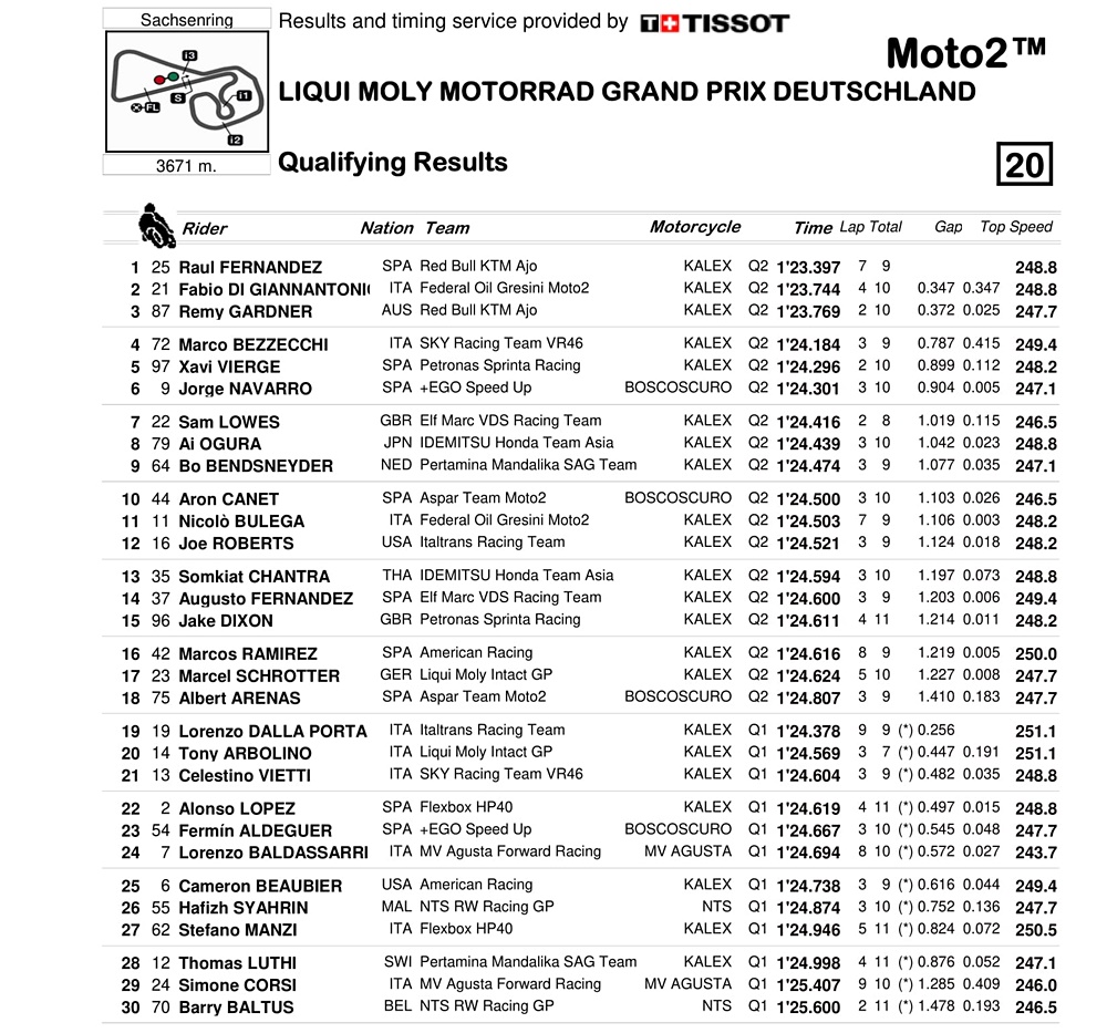 BalapMotor.Net – Raul Fernandez keluar sebagai peraih pole position dalam kualifikasi Kejuaraan Dunia Moto2 putaran ke-8 yang berlangsung di sirkuit Sachsenring, Jerman, Sabtu (19 Juni).
