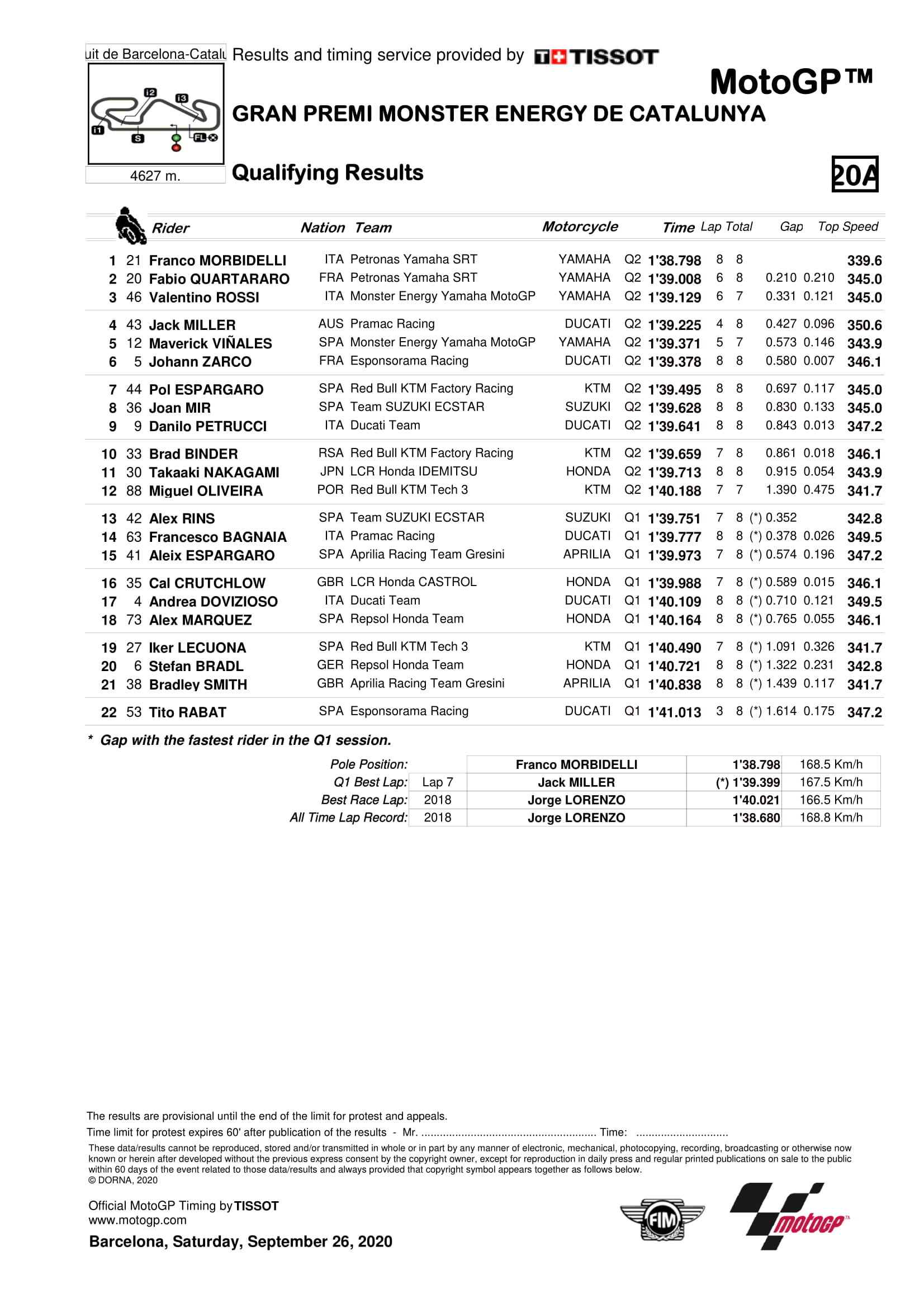 Franco Morbidelli (Petronas Yamaha SRT) mencatatkan waktu di angka 1’38.798s dan berhasil meraih pole position pertama sepanjang karirnya di balap MotoGP. Fantastisnya, hanya Morbidelli yang sanggup menyentuh angka 2 menit 38 detik dan hampir memecahkan rekor laptime sirkuit Catalunya.