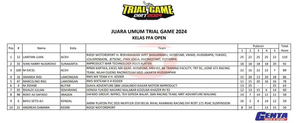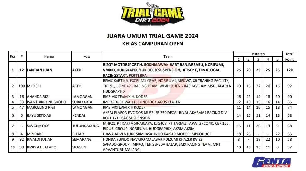 Rider dari Tim Rizqy Motorsport ini sukses merengkuh gelar Juara Umum Trial Game Dirt 2024 di kelas utama FFA dan Campuran Open. Pada sesi Heat 3 dan Heat 4 yang berlangsung sore hingga malam, Lantian Juan bermain cerdik dan mampu mengamankan posisinya di klasemen.