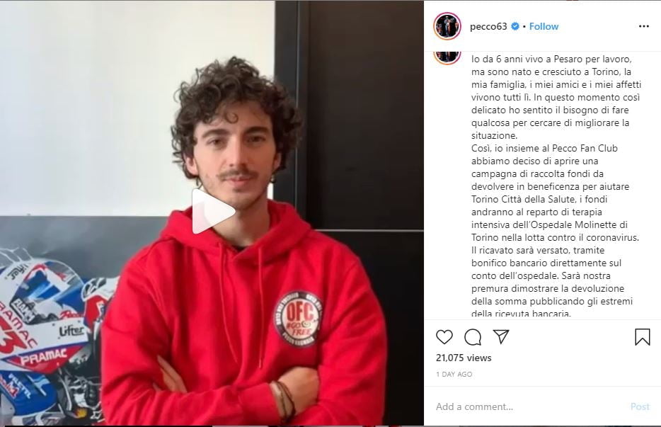 Lewat Instagram pribadinya, Bagnaia pun mengumumkan penggalangan dana yang ia bentuk dengan klub penggemarnya. Menurut Bagnaia, dana yang terkumpul nantinya akan dikelola oleh sebuah yayasan yang membantu penanganan kasus corona di Rumah Sakit Molinette di Turin.