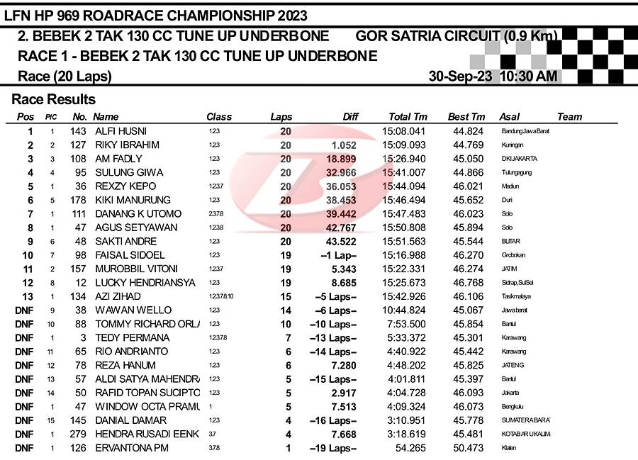 Selapas itu, terpantau hanya Riki Ibrahim yang berusaha mengejar. Namun konsistensi Alfi Husni di trek dadakan ini sangat bagus. Alhasil, ia menang dengan mulus!! Selamat… (***)
