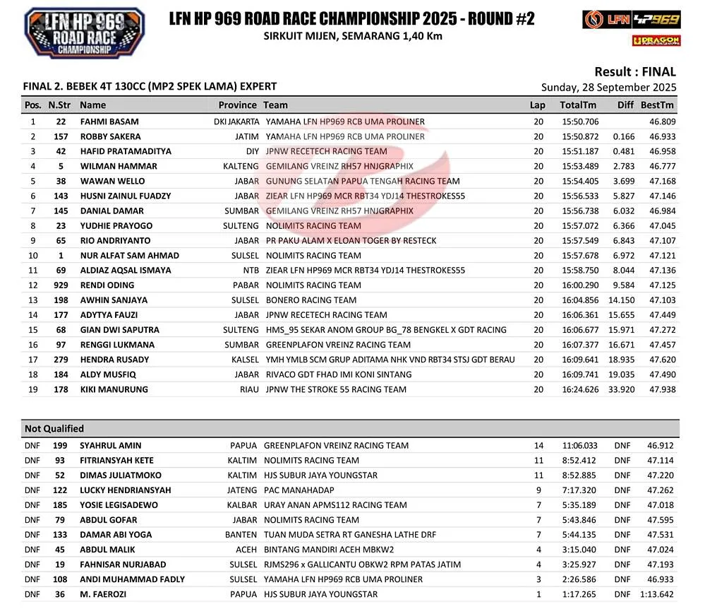 BalapMotor.Net – Penampilan istimewa ditunjukkan duet LFN HP969 Racing Team di pertarungan Bebek 4T TU 130cc (ex.MP2) Expert LFN HP969 Road Race Championship Seri 2 di Sirkuit Mijen, Semarang (27/9).