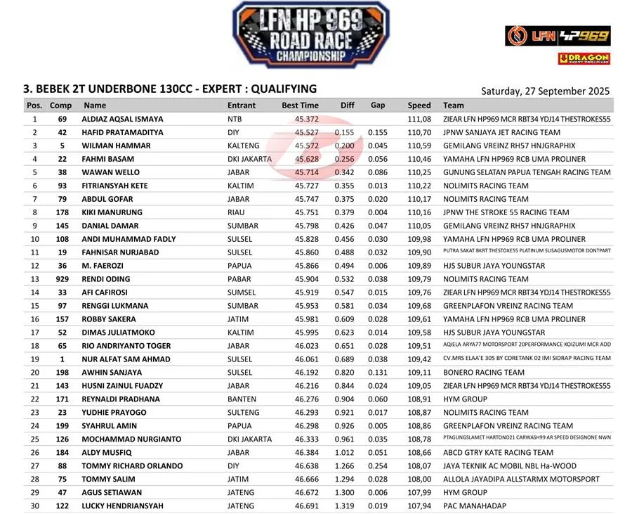 BalapMotor.Net – Aldiaz Aqsal Ismaya catat waktu terbaik di kualifikasi Underbone 2T 130cc Expert LFN HP969 Road Race Championship Seri 2 di Sirkuit Mijen, Semarang (27/9).