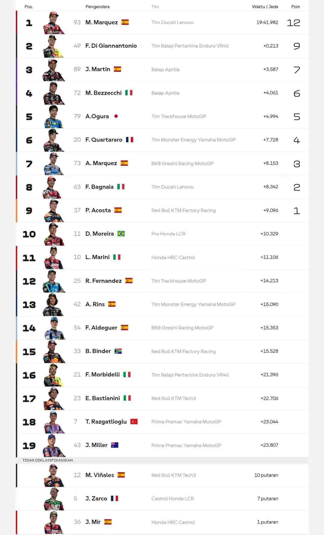 Pembalap Ducati Lenovo Team tersebut tampil dengan begitu tenang sepanjang balapan. Awalnya, ia berada di posisi ketiga. Setelah itu, Marc mampu melibas Fabio Quartararo.