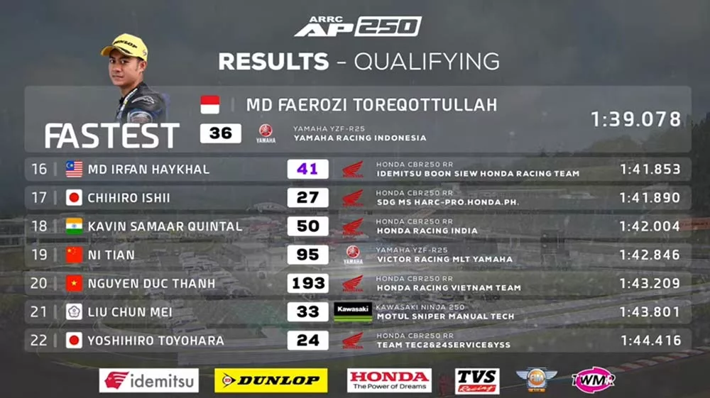 BalapMotor.Net – Pembalap asal Lumajang,Jawa Timur M Faerozi Toreqottullah berhasil menempati grid terdepan dalam gelaran Asia Road Racing Championship (ARRC) RD3 di Sugo, Jepang kelas AP250.