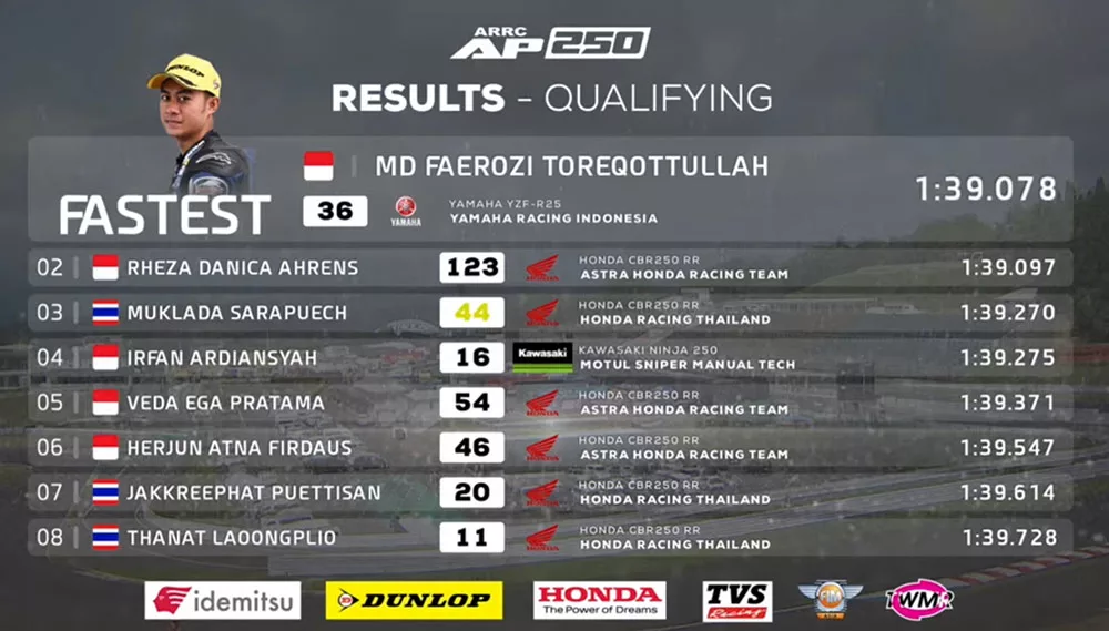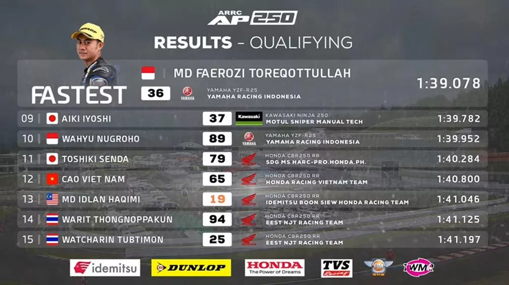 BalapMotor.Net – Pembalap asal Lumajang,Jawa Timur M Faerozi Toreqottullah berhasil menempati grid terdepan dalam gelaran Asia Road Racing Championship (ARRC) RD3 di Sugo, Jepang kelas AP250.