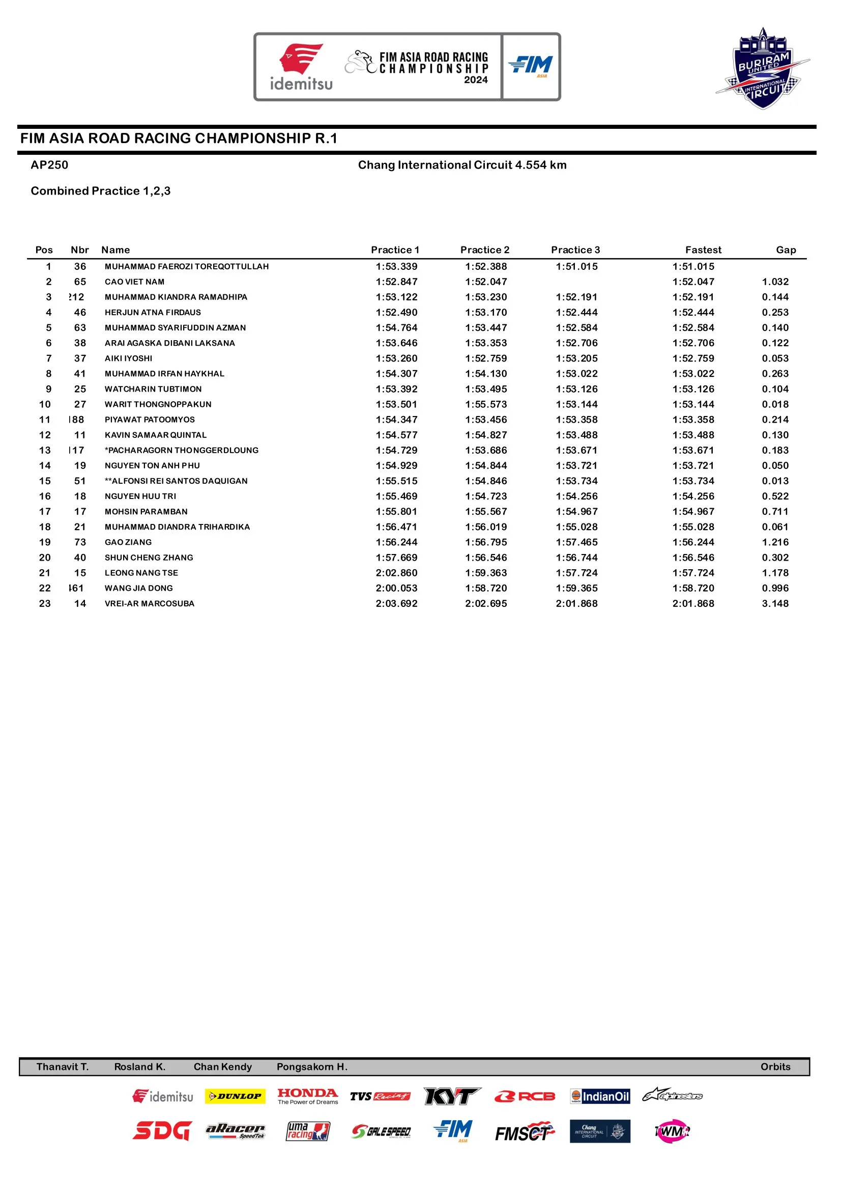 Menariknya, dengan menunggangi Yamaha YZF-R3, M Faerozi unggul 1 detik daripada rider asal Vietnam yaitu Cao Viet Nam (Honda Racing Vietnam) yang tercepat kedua pada sesi hari ini. M Faerozi mencetak best time 1 menit 51.015 detik.