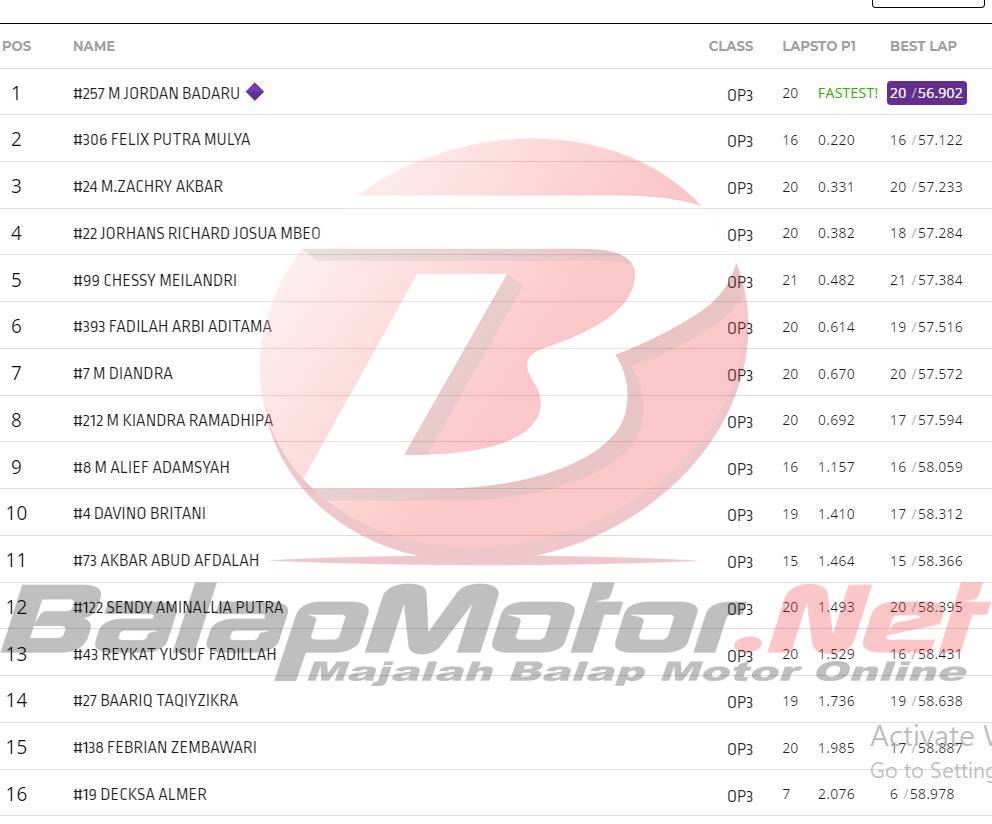 Jordan yang membela tim Yamaha Yamalube Ziear The Strokes55 mencetak best time 56.902 detik dan mengungguli Felix PM (DRT35) yang tercepat kedua dengan best time 57.122 detik. Sementara itu pada posisi ketiga diraih oleh M.Zachry Akbar (Honda BKJU).