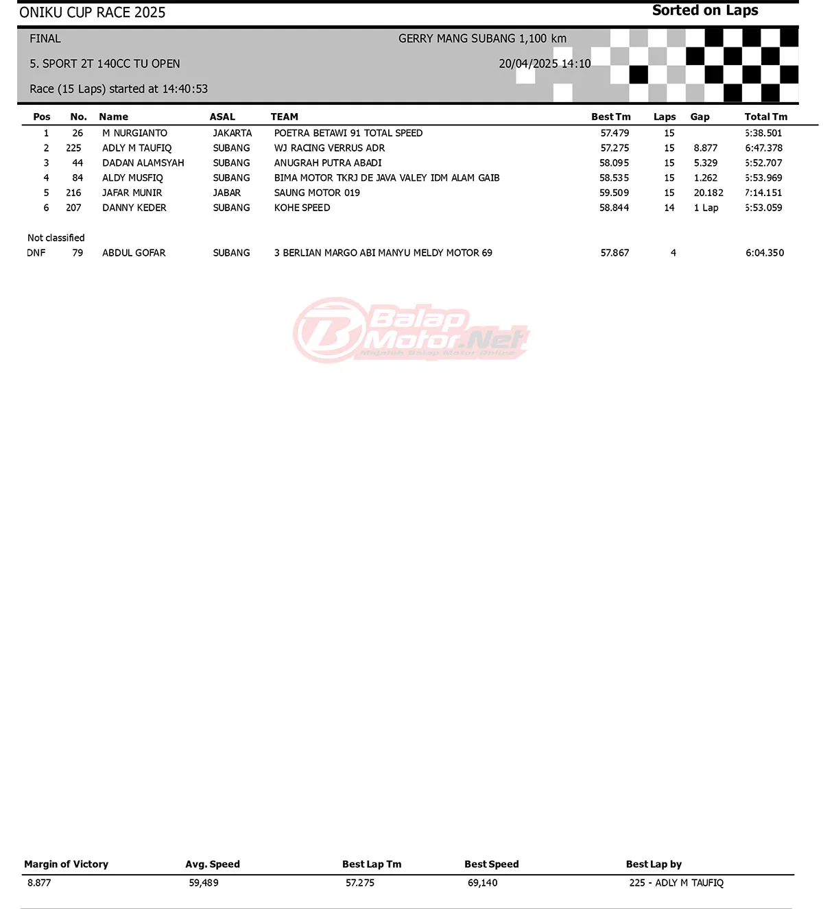 BalapMotor.Net – M Nurgianto dari Poetra Betawi 91 Total Speed berhasil menunjukan dominasinya pada kelas Sport 2 Tak 140cc TU Open (RX-King Superpro) ronde pembuka Oniku Cup Race 2025 di Sirkuit Gery Mang, Subang (20/4).