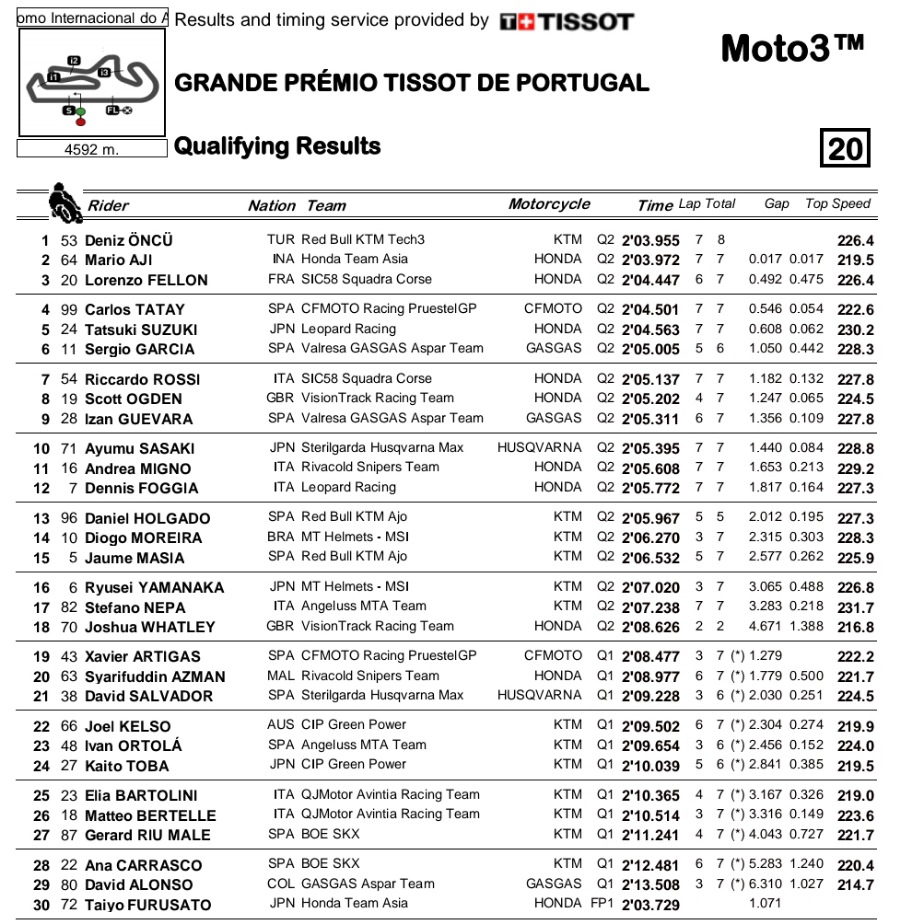 Namun Deniz Oncu menggagalkan peluang Mario. Meski begitu, ini jadi raihan manis Mario sebagai rookie di Moto3. Bila besok race berlangsung dalam kondisi hujan, kesempatan Mario untuk meraih podium pertamanya akan terbuka lebar.