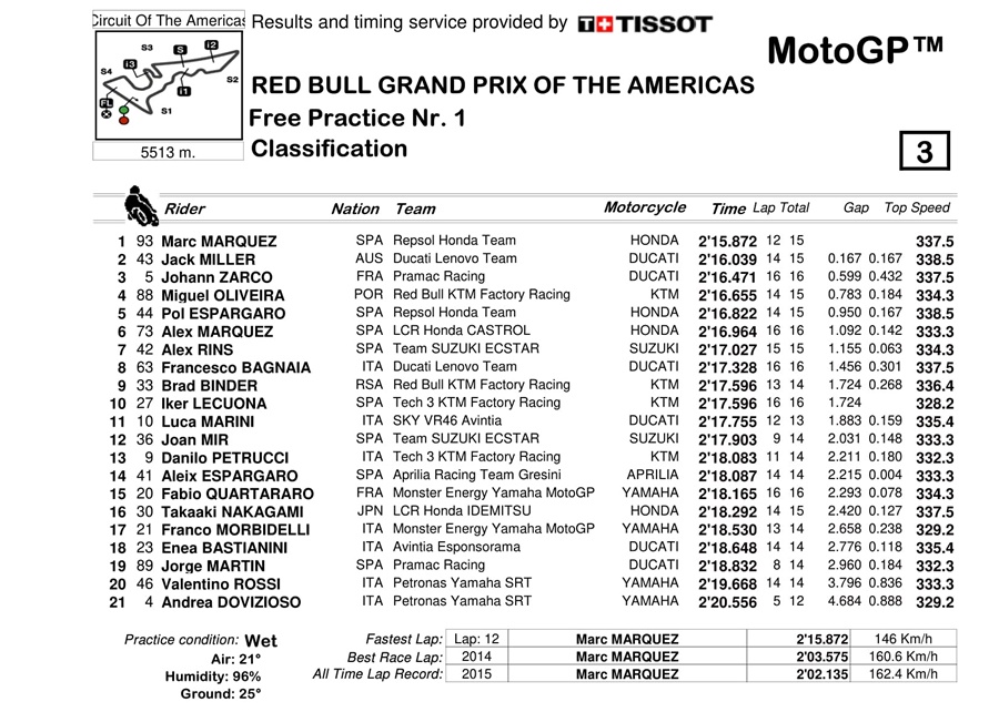 Hasilnya, Marc Marquez sukses menjadi yang tercepat. Pembalap Repsol Honda itu kembali membuktikan sebagai raja Austin. Marc sendiri sudah memenangkan enam gelar di lintasan sepanjang 5,513km tersebut. Catatan waktu Marc Marquez 2:15.872 detik dalam kondisi lintasan basah.