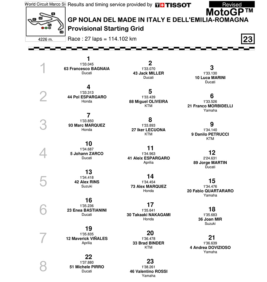 “Saya tidak senang, posisi awal dapat diterima bahkan jika kami bisa memulai setidaknya dari baris kedua. Untuk saat ini kami bisa bertarung untuk 5 besar,” jelas pembalap Spanyol yang sudah meraih delapan titel juara dunia itu.