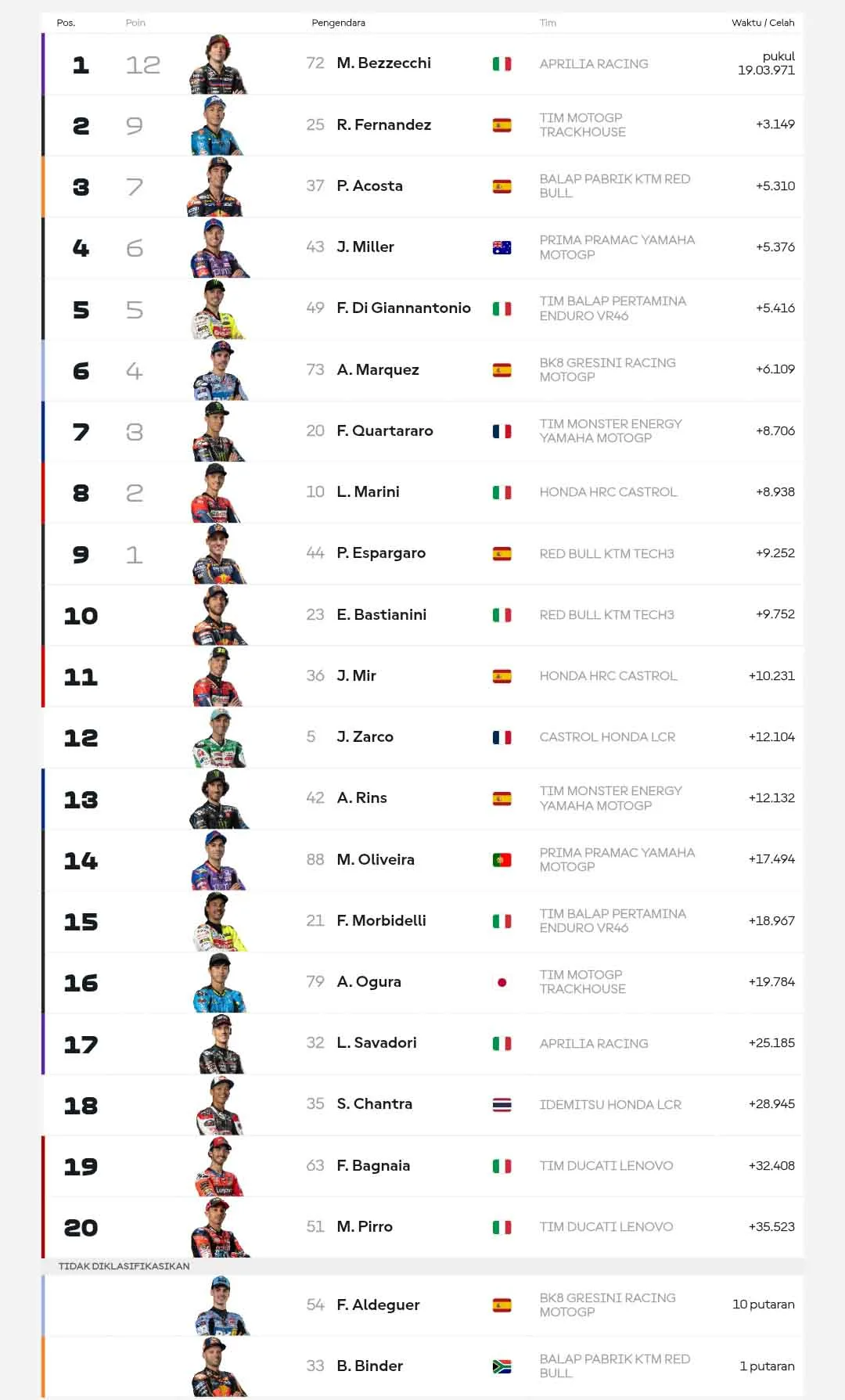 Tiga lap terakhir menjadi pembuktian Bezzecchi. Ia melibas rekan satu pabrikan itu dan langsung memberikan gap hingga garis finis. Kemenangan lanjutan bagi Marcobez.