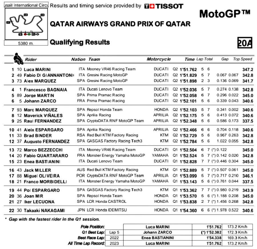 Pembalap Italia tersebut menorehkan waktu tercepat di Q2 sekaligus menjadi rekor lap baru dengan waktu 1’51.762 detik. Marini sendiri memimpin rombongan Ducati yang menguasai enam besar.