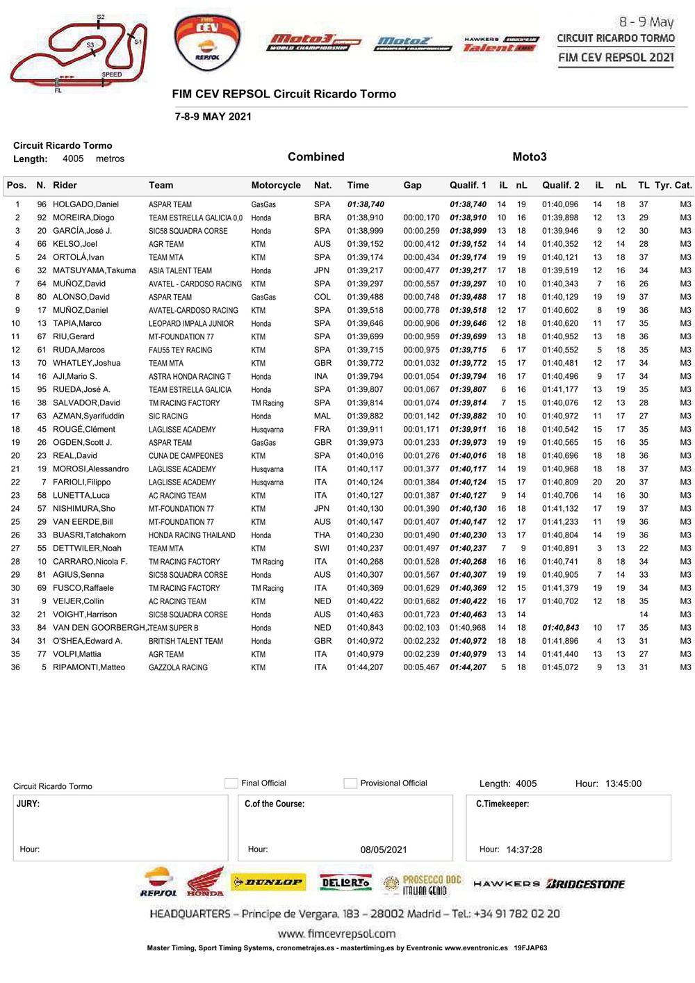 Babak kualifikasi sudah dijalankan pada hari Sabtu. Mario Aji Astra Honda Racing Team (AHRT) harus puas berada di posisi ke-14 dari total 36 pembalap. Bocah asal Magetan itu mencatat waktu 1’39,794 detik.