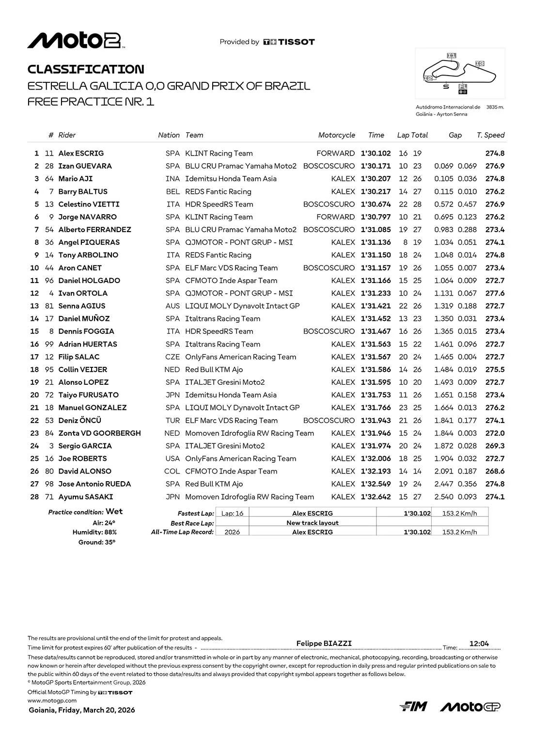 Posisi pertama ditempati oleh Alex Escrig dari KLINT Racing Team dengan waktu 1 menit 30,102 detik. Sementara itu, Izan Guevara yang membela BLU CRU Pramac Yamaha Moto2 berada di posisi kedua dengan catatan 1 menit 30,171 detik .