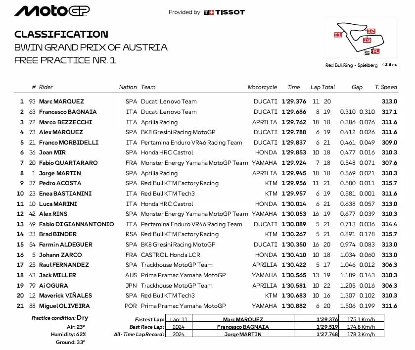 Pada FP1, Marc dibayangi rekan setimnya dan juara tiga tahun beruntun di Spielberg. Sementara pada Practice penentuan menuju Q2, Marquez ungguli Pedro Acosta.