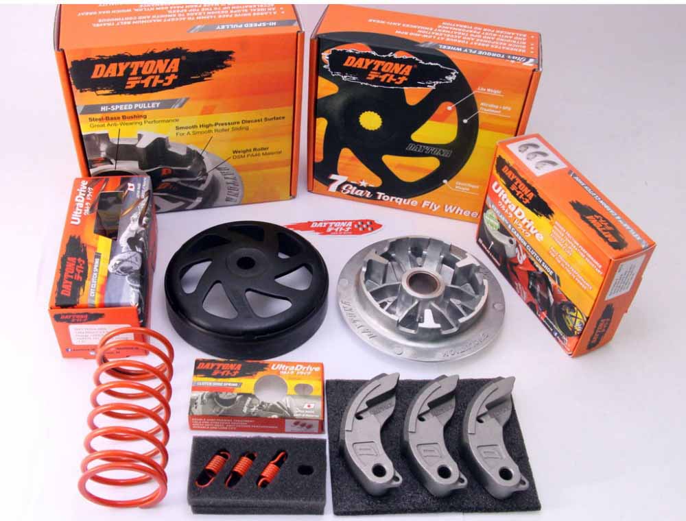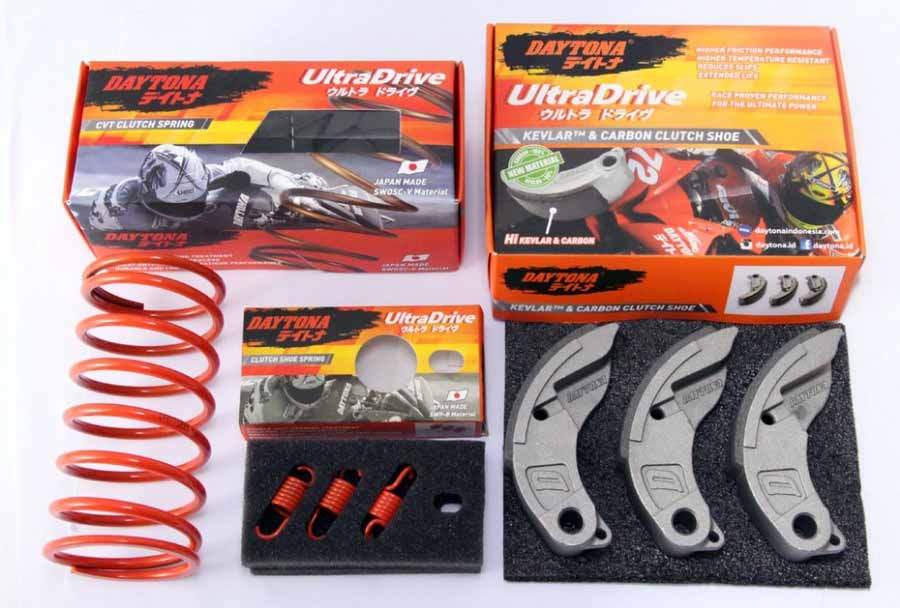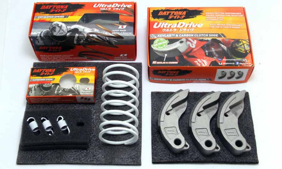 Seperti untuk Vario 125/150, Daytona menyediakan paket kiriman CVT dengan tiga part sekaligus. Ada kampas ganda karbon kelvar, per CVT dan per sentri. Bila sudah terpasang, suara geredek pun bisa teratasi.