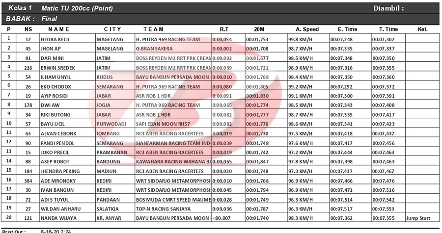Matic TU 200cc dengan bendera H.Putra 969 Racing Team tersebut tak terlawan. Agung Benggol jawara kelas pemula dengan 7,342 detik dan dipertajam Hendra Kecil di kelas open dengan 7,302 detik.