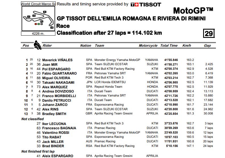 Akibat hukuman tersebut, Quartararo harus menyerahkan podium ke 3 kepada Pol Espargaro (Red Bull KTM). Berikut hasil selengkapnya dari gelaran MotoGP Emilia Romagna Misano 2020