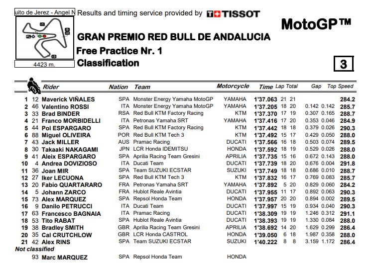 Sementara itu 3 pembalap (Alex Rins, Cal Crutchlow dan Marc Marquez) yang comeback setelah alami cedera di MotoGp Spanyol 2020 yang berlangsung pekan kemarin masih berada di urutan paling bawah pada sesi FP1 MotoGP Andalusia 2020. SO, Berikut hasil selengkapnya dari sesi FP1 MotoGP Andalusia 2020