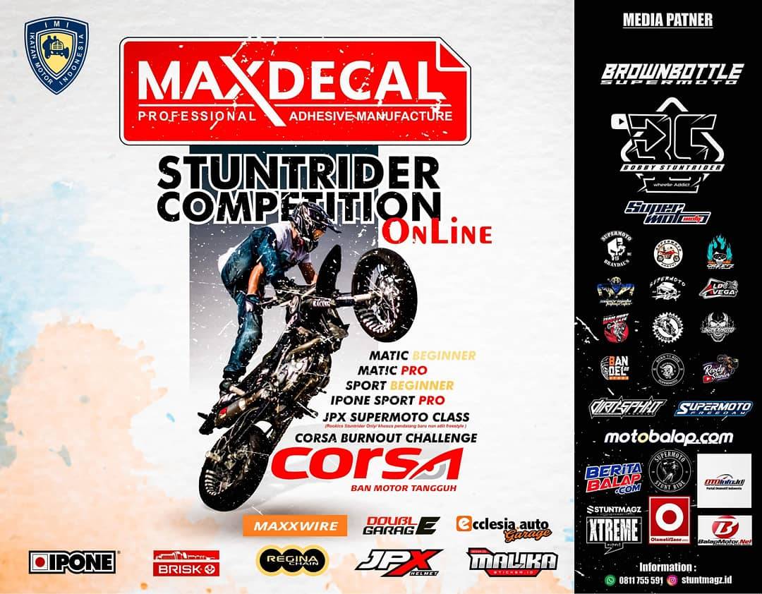 Kompetisi Online bertema MAXDECAL STUNTRIDER COMPETITION 2021 yang menjadi sponsor utama yakni MaxDecal yang diketahui sebagai Sticker Decal Terbaik di Indonesia telah memiliki Otomotive Grade yang bisa didapatkan diseluruh decal factory seindonesia.
