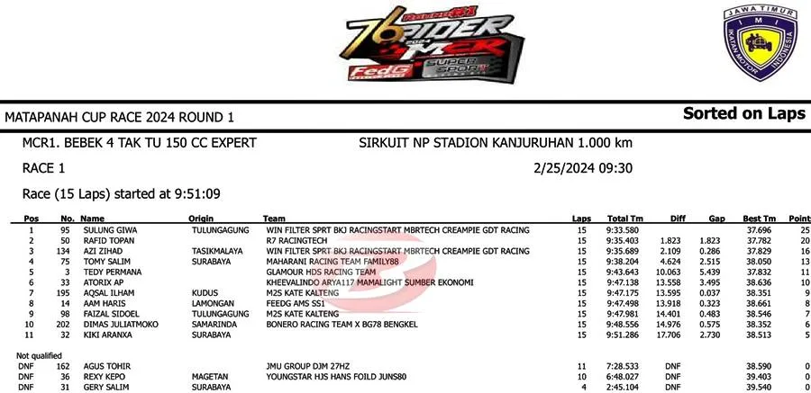 BalapMotor.Net – Sulung Giwa akhirnya keluar sebagai juara pada Race 1 MP1 (Expert) kejuaraan Matapanah Cup Race (MCR) putaran pertama yang berlangsung di Kanjuruhan, Malang.