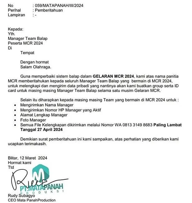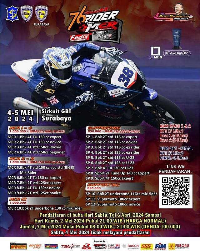 Penerapan ini di mulai pada saat seri 2 MCR hingga berakhir nya seri, otomatis akan berkelanjutan semua menejer tim di wajibkan registrasi untuk pendataan diri dan tim. Kemudian pada hari jumat 3 Mei 2024 sore akan kita adakan brifing,” terang Rudi Ceklek.