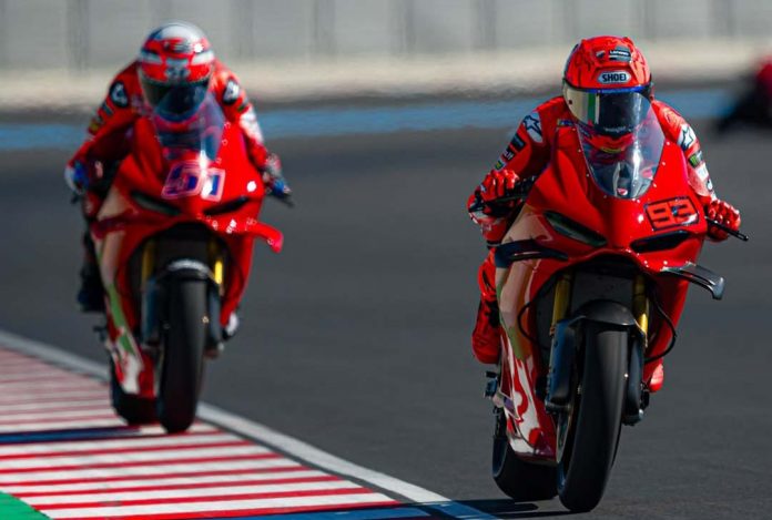 ‎Marc Marquez, Pecco Bagnaia, Alex Marquez dan yang lainnya memakai Ducati Panigale V4. Juga pembalap penguji Michelle Pirro juga hadir.