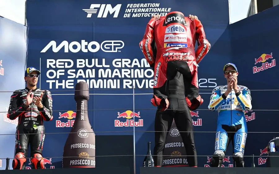 Marc memutuskan untuk merayakan kemenangannya di Misano dengan cara ini. Sebuah respons yang jelas untuk membungkam para pembenci dan menegaskan kembali siapa yang menjadi nomor 1 di kejuaraan saat ini.