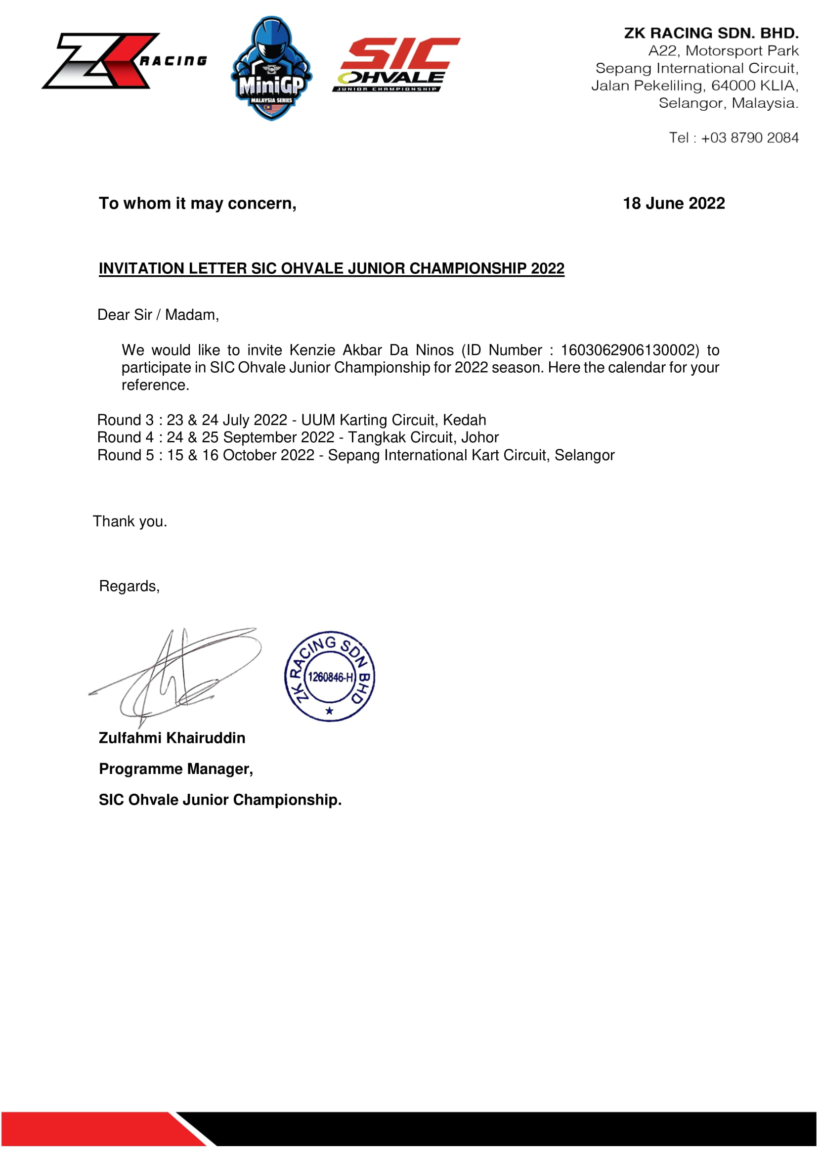 Undangan secara resmi dari pihak penyelenggara SIC Ohvale sendiri sudah diterima oleh Nino Andrian sang ayah dari Abang Ijack (suratnya terlampir di bawah tulisan ini). Untuk ronde ketiga sendiri bakalan berlangsung di sirkuit Tangkak, Johor pada 23-24 Juli nanti.