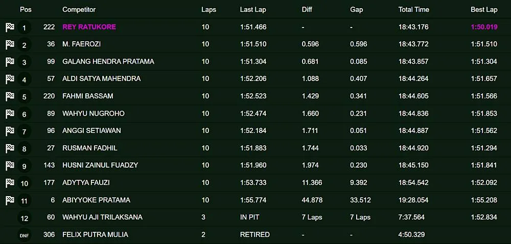 Poin rapat dari tiga pembalap teratas. Nah, sebagai pemimpin klasemen, Galang Hendra pun menargetkan poinnya tetap aman. Pada balapan kedua ini, dia berusaha keras untuk finis di posisi yang bagus.